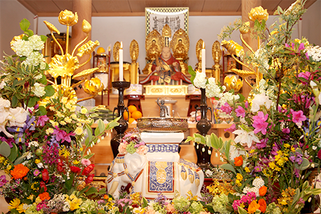 お参りになるに際して、皆さまよりお持ちいただいた花々で、御宝前には、お釈迦様のお生まれになった花園が現れます。皆さまもご一緒に真心の花々をお供えし、お釈迦様の誕生日をお祝いしましょう。