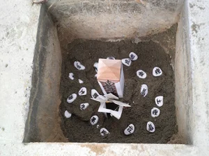 本堂の上棟に向け柱が立ち始めたこの日、地鎮祭の時の勝軍木を、経石と共に本堂の中央から地中に納めました。