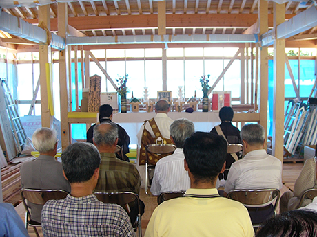 法要のあとは、棟梁が本堂の一番上の柱を大きな木槌で打ち付け、棟上げとなりました。