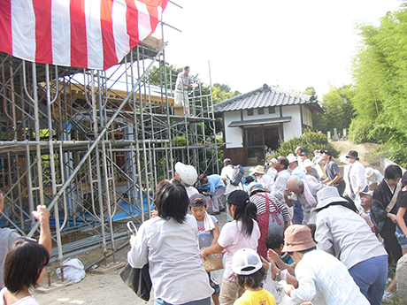その後、無事に上棟した事を祝い、住職・総代・建設委員が足場に上がり餅を撒きました。住職が持っていた升の中には福銭が入っていて、餅に混じって降ってくるおひねりを皆、楽しそうに拾っていました。