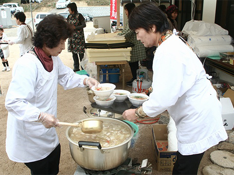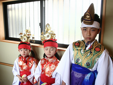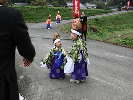 祭壇には御曼荼羅ご本尊を中心に塩・米・酒・野菜・乾物・果物・菓子が供えられ、敷地の四隅には紅白の重ね餅酒・塩・米の他に大豆・小豆・麦・稗・粟の五穀が供えられました。
