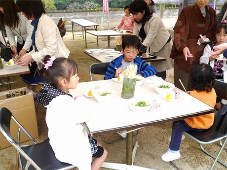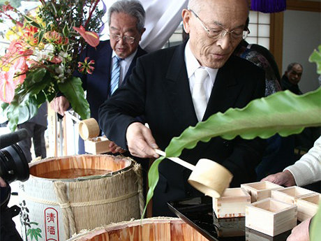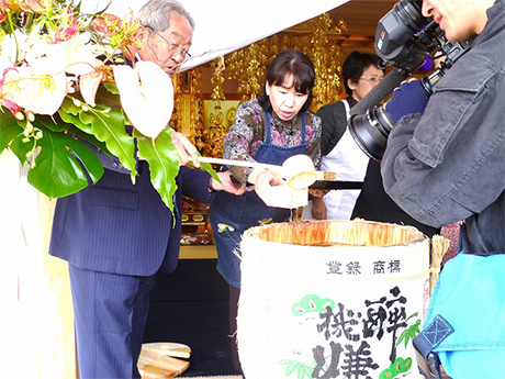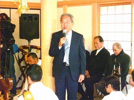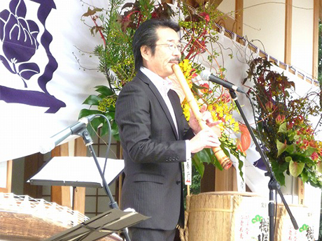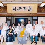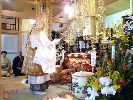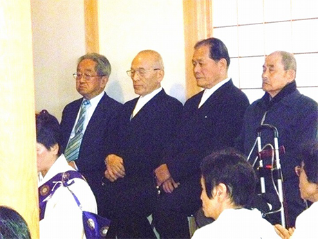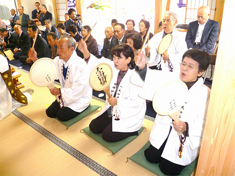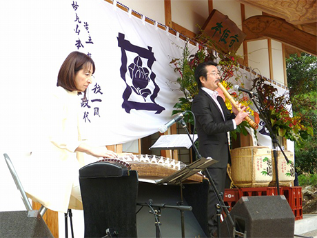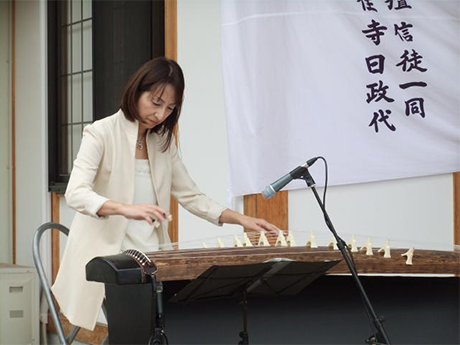 その記念写真の撮影後、法要では天童祭文や御宝前法楽、慶讃文などを修め、挨拶・謝辞、閉式の後、六ツ森先生方の箏曲奉納と鏡開きと続き、にぎやかにも楽しい清興で本住寺の落慶をお祝いすることができました。